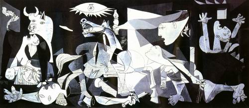 在西班牙内战中,1937年4月26日下午,协助佛朗哥叛军作战的德军轰炸了西班牙的一座巴斯克历史名城——格尔尼卡。在这个全镇居民只有7000来人的小镇上,炸死1654人,炸伤889人,格尔尼卡化为平地。面对法西斯的残暴行经,毕加索在极度的愤怒和痛苦之中,唤起了狂热的创作激情。他只用了一个月的时间,就以这起事件为题完成了举世闻名的《格尔尼卡》。这幅画4米多高,约9米长,整整占据了两面墙壁。使人震惊的不仅仅是画的尺寸,这幅以生与死、善与恶、和平与战争为主题的巨作,从内容到手法都是震撼人心的。该画运用立体主义的绘画形式,以变形、象征和寓意的手法描绘了在法西斯兽行下,人民恐惧痛苦和死亡的悲惨情景。整幅作品以白、黑、灰为基调,弥漫着悲壮、阴郁、压抑、恐怖的气氛,不规则的线条形成的角和弧的交错,给人一种支离破碎和动乱的感觉。作品中央是一匹引颈哀鸣的马,一只长矛穿进了它的背部。这匹马象征西班牙人民。马的身下倒着一位被撕成碎片的男人,他手上还紧紧握着一柄折断了的剑。剑旁边有一朵鲜花,这朵花是对死去战士的悼念。图中的四位妇女,她们尖叫着,哀号着,有的正从着火的楼上逃跑,有的正抱着死去的婴孩仰天哭喊,有的无望地伸展着手臂……一个妇女从窗子里探出身体,右手举着一盏油灯,油灯的左上方有一盏像眼睛似的电灯,灯光像锯齿一样射向四周。画的左上方,有一头立着犄角、冷漠无情的牛,这个牛头代表法西斯的残暴和黑暗。这些象征表白画家将要把这一切罪恶和黑暗暴露于光照之下,昭示于全世界面前。后来,毕加索曾解释说:“画面中发出嘶烈哀鸣的马,是西班牙人民的象征,牛代表了人民所受到的种种苦难,以及这些苦难所造成的暴烈恐怖气氛,反映了法西斯的暴行。”