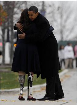 图片2:11月11日是美国老兵纪念日,在芝加哥青铜烈士纪念碑前敬献花圈后,美国当选总统奥巴马拥抱了在伊拉克战争中失去双腿的老兵汤米达科沃斯。