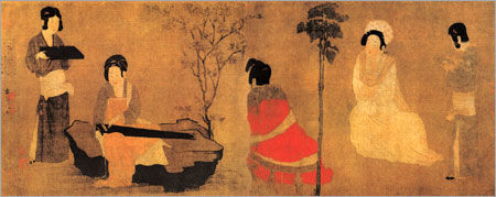 周昉, 字景玄, 又字仲朗, 生卒年不详, 京兆(今陕西西安)人。出身贵族家庭, 先后官至越州、宣州长史。工仕女, 初学张萱, 多写贵族妇女,亦擅肖像, 有兼得神情之誉。还擅作宗教画, 创造有民族风俗的“水月观音”,人称“周家样”。图中共画五人,中间三人为宫中贵,一人于石上调琴,另两位一边啜茗,一边侧耳静听琴声。两侧侍者,一人手端茶托,一人执茶杯。人物神念娴静端庄。人物组合有坐有立,疏密得体,富有变化