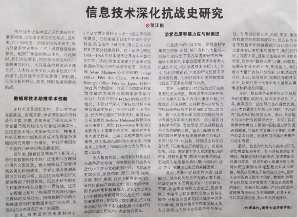 2017年12月11日的《中国社会科学报》 上发表的《信息技术深化抗战史研究》指出“相信经过数年建设,抗日战争与近代中日关系文献数据平台必将对中国抗战史研究产生革命性的意义。”