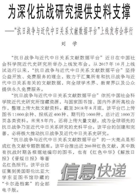 《人民日报》以《为深化抗战研究提供史料支撑——“抗日战争与近代中日关系文献数据平台”上线发布会举行》为题,对此次发布会进行了报道。