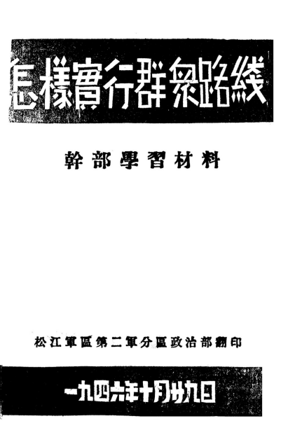 抗战文献数据平台上现已上传了三万多种图书。关于这三万多种图书,时段上主要集中于1931年至1945年,但并不局限于此,在这15年以外,平台上仍然保存着大量的与抗日战争与近代中日关系相关的史料。同时,在责任者、出版地等方面,这一万种图书亦基本涵盖了中国各地,以及抗日战争及其前后存在于中国领土上的各股政治力量。下图为解放战争期间,我党在东北出版的《怎样实行群众路线(干部学习材料)》。
