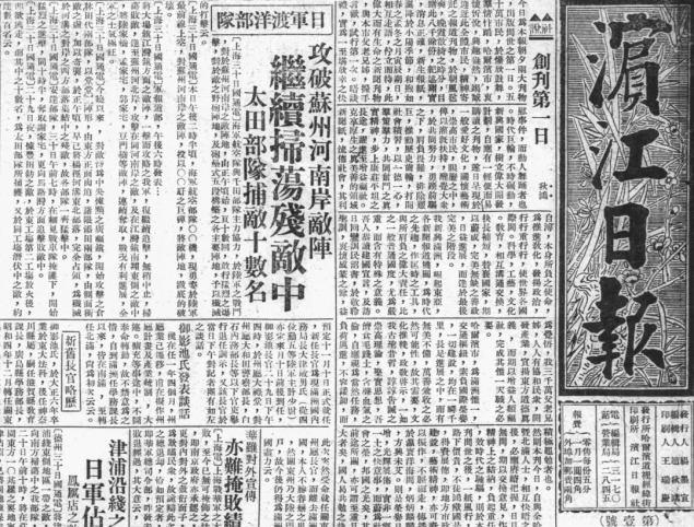 抗战文献数据平台上现有八百多种报纸。其中,既包括近代中国的四种“大报”(《申报》、《大公报》、《益世报》与《民国日报》),也包括上海的各类小报、画报(近一百种),如《福尔摩斯》、《金钢钻》等。同时,从近二十种红色文献到国民党甚至是“忠义救国军”的报纸,如《中央日报》、《民吁日报》、《前进日报》等,以及青年党的报纸,如《醒狮》、《青年中国》等,平台上的报纸涵盖了近代中国各主要党派的主要报纸。此外,平台上还有近三十种日伪报纸,包括从伪满洲国到华北、华中与华东沦陷区的日伪报纸。下图即是伪满洲国报纸《滨江日报》的创刊号。