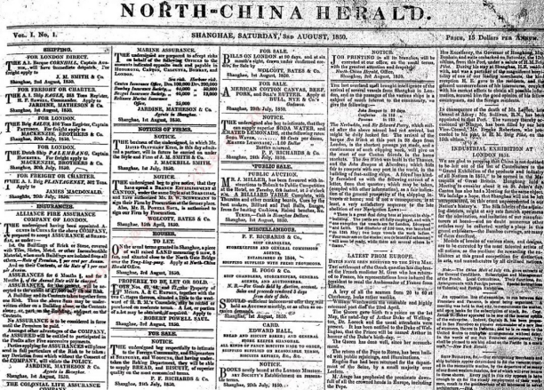 从地域上看,抗战文献数据平台上报纸的创刊地基本上涵盖了今天中国的主要省份,合计有二十多个。此外,平台亦呈现了几份海外的华文报纸与国内的西文报纸,如《大汉公报》与《北华捷报》等。同时,平台上尚有许多地方报纸,分布在中国许多中小城市,如无锡的《轰报》、许昌的《新民日报》等。下图即是《北华捷报》的创刊号。