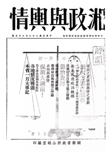 抗战文献数据平台上现有两千多种期刊。正如图书类史料一样,平台上的期刊类史料在时段、责任者、出版地与语种上分布广泛。特别值得一提的是,相对图书与报纸这两类史料,期刊类史料有着数量与种类上更多的地方性史料。下图是抗战期间湖南省政府编印的《湘政与舆情》的创刊号。