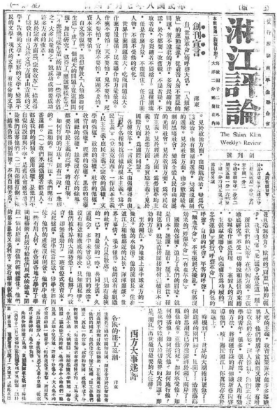 抗战文献数据平台上现有两百多种红色文献。除了较重要的《解放日报》、《新华日报》、《晋察冀日报》、《红色中华》及《八路军军政杂志》外,尚有不少较为稀见的、由各根据地内部发行的红色文献,如分别在华北抗日根据地与华中抗日根据地创办的《前线》、《真理》等。下图即为《湘江评论》的创刊号。