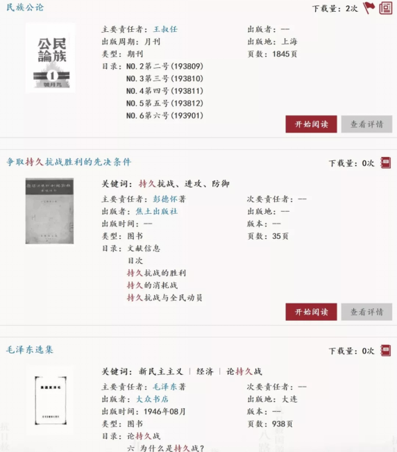 以上就是使用抗战文献数据平台的主要流程与注意事项。为了广泛听取用户的意见与使用体验,欢迎大家关注抗战文献数据平台(modern_history)的公众号或来函(kzpt-jd@cass.org.cn),惠告您的宝贵意见。