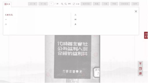 进入史料阅读界面以后,我们可以勾选阅读界面上的多个按钮,或调出该史料的目录,或放大、缩小乃至全屏阅读,或下载需要的内容(得免费注册平台的账号方能下载),或进行纠错等。
