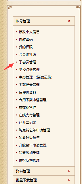主账号登录会员中心(https://www.zxls.com/user/default.aspx),查看左侧菜单,找到【子会员管理】