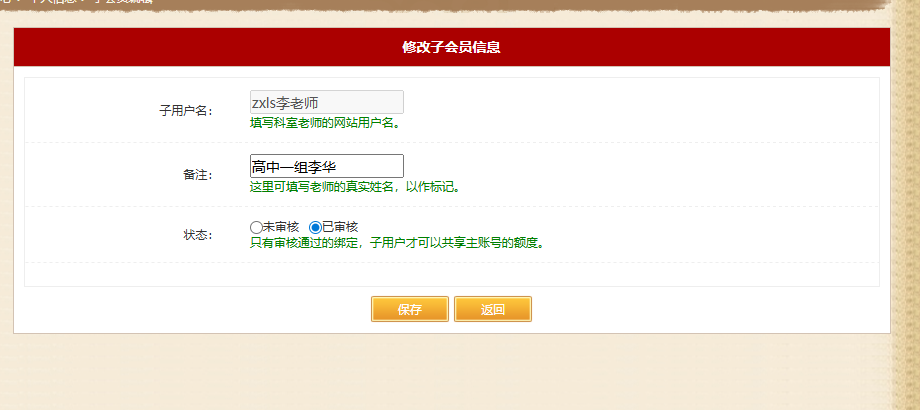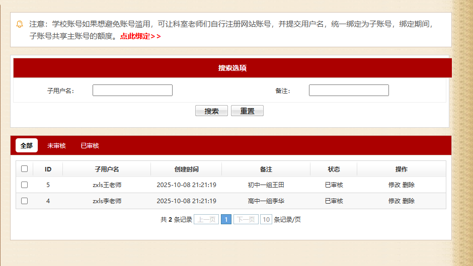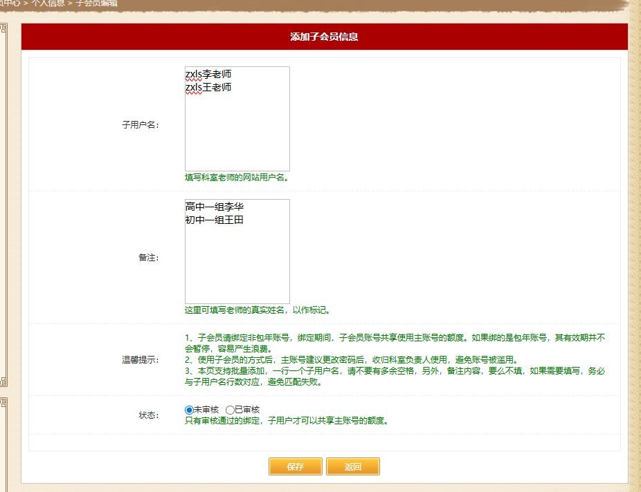 在批量添加页,按要求填入收集到的科室老师的用户名,状态看情况选择,已审核的绑定记录,子用户就可马上使用主账号的下载额度,如下图: