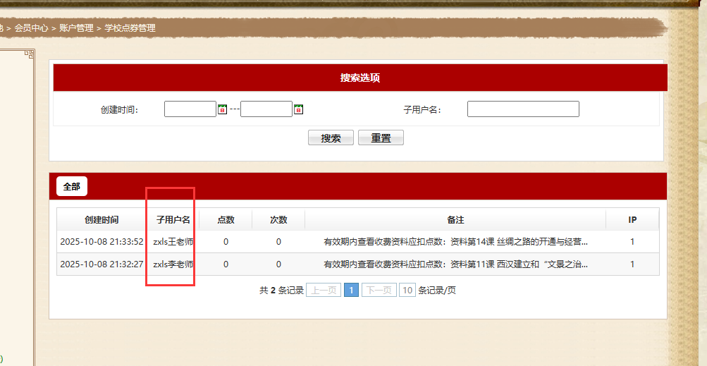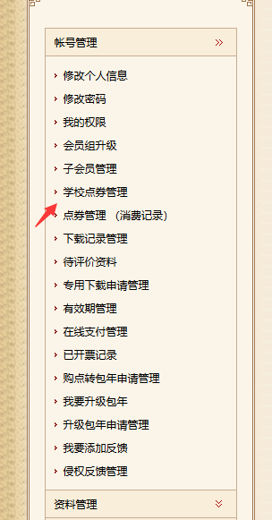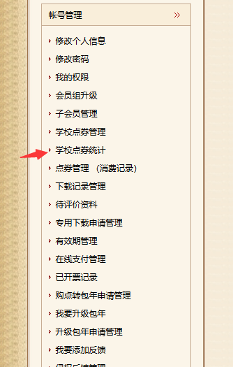 (1)子用户登录会员中心后,左侧菜单找到【学校点券管理】。