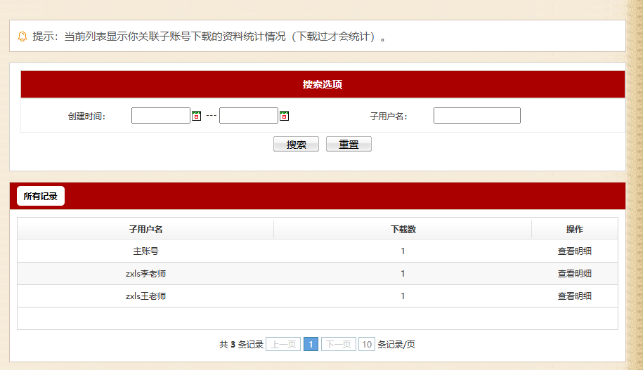 (3)检查子用户下载的资料统计情况。